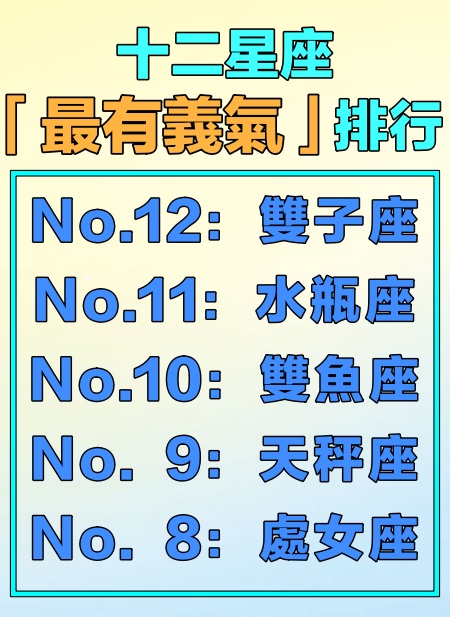 當之無愧的第一名!獅子座天生講義氣,重面子也重情義,朋友有事他絕對第一個跳出來。他喜歡被需要,也樂於成為大家的靠山。不只是講義氣,是「講到底」!