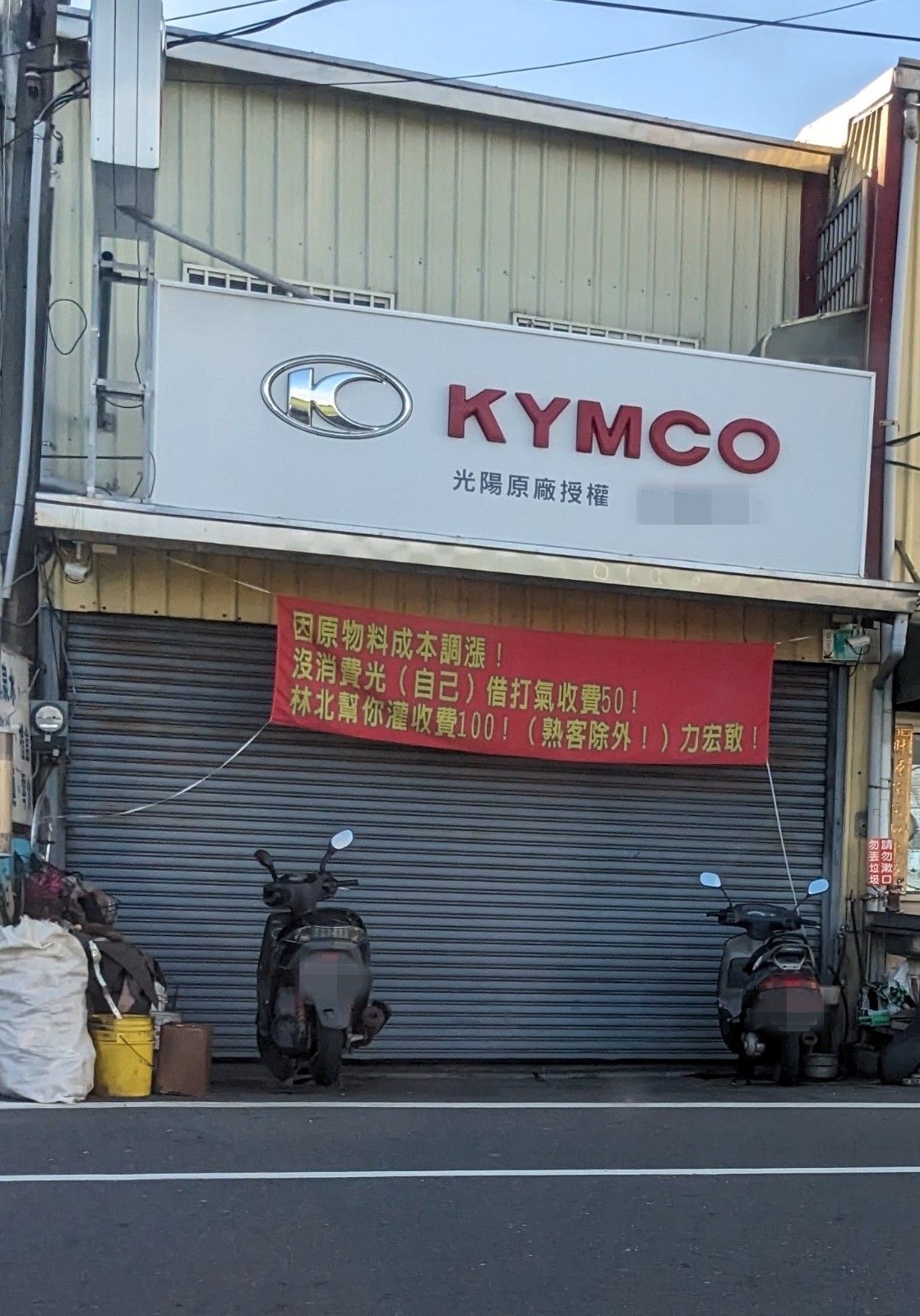 據《三立新聞》報導,該機車行在招牌下方拉布條,寫道:「因原物料成本調漲!沒消費光借打氣收費50,林北幫你灌收費100 (熟客除外)」不少網友狂酸頭家不會做生意:「打氣跟原物料調漲有什麼關係?」、「空氣是從廠商一袋袋叫來的?」、「趕走隱藏客源,你就慢慢做你的熟客。」、「免費服務賺到的可能是一輩子的客人。」、「50元沒多少,但看老闆的行事作風,我不會進去修,怕被當盤子。」