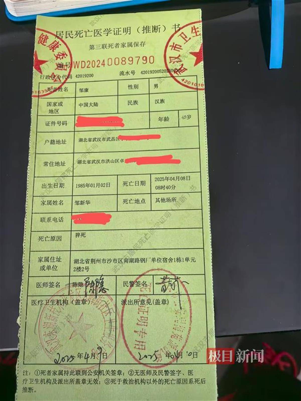 「再也不能和兒子聊天了…」淚水在胡瑞瓊的眼眶打轉。記者走進鄒康的卧室,床鋪整潔,出差時用的背包還在,每天都使用的筆記型電腦也在,但已無法再見鄒康的身影。武漢東湖新技術開發區九峰街社區衛生服務中心出具的居民死亡醫學證明顯示,鄒康的死亡原因為猝死,死亡時間為4月8日上午8時40分。