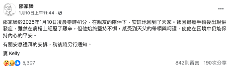 原本7日宣布啟動舒緩性治療,卻在10日傳出病逝消息,邵家臻的妻子Kelly透過社群媒體發文證實噩耗,透露因胃癌手術出現併發症,丈夫在親友陪伴下安詳離開,她也提到,丈夫即使在病榻上受苦,仍保持堅毅精神,感受到天父的眷顧,即使面對困境,內心始終保持平靜,關於後事安排,將另行通知!