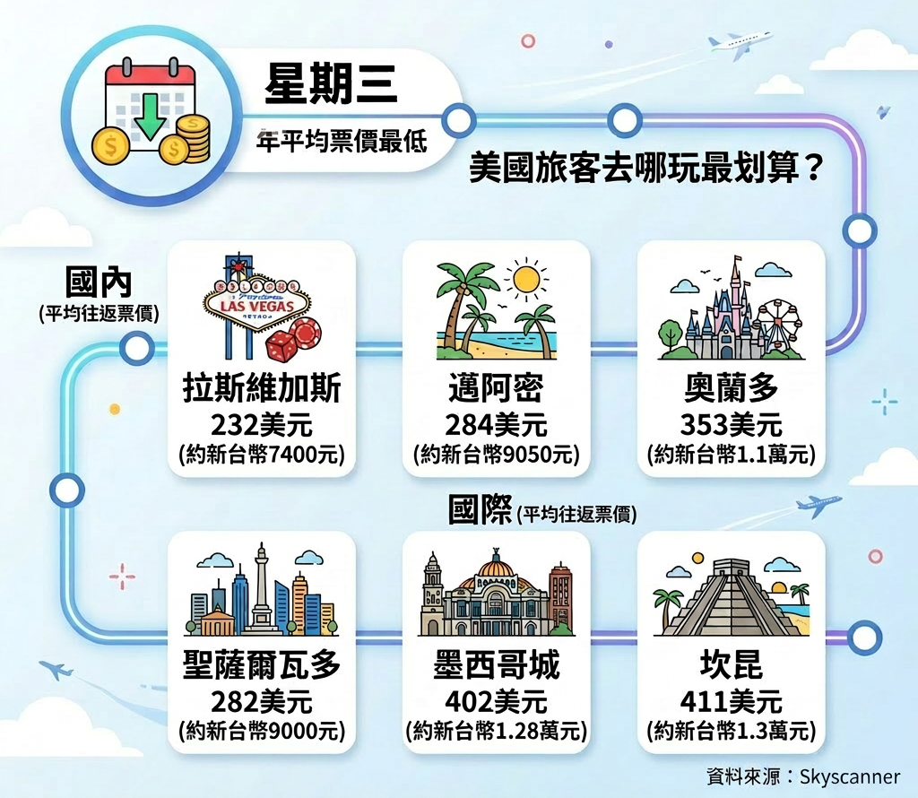 Skyscanner解釋,雖然最划算的日期會隨著航線與月份變動,但每週三由於商務需求較少,機票價格通常比較親民。此外,該平台也整理出2026年美國旅客最省錢的10大旅遊目的地。