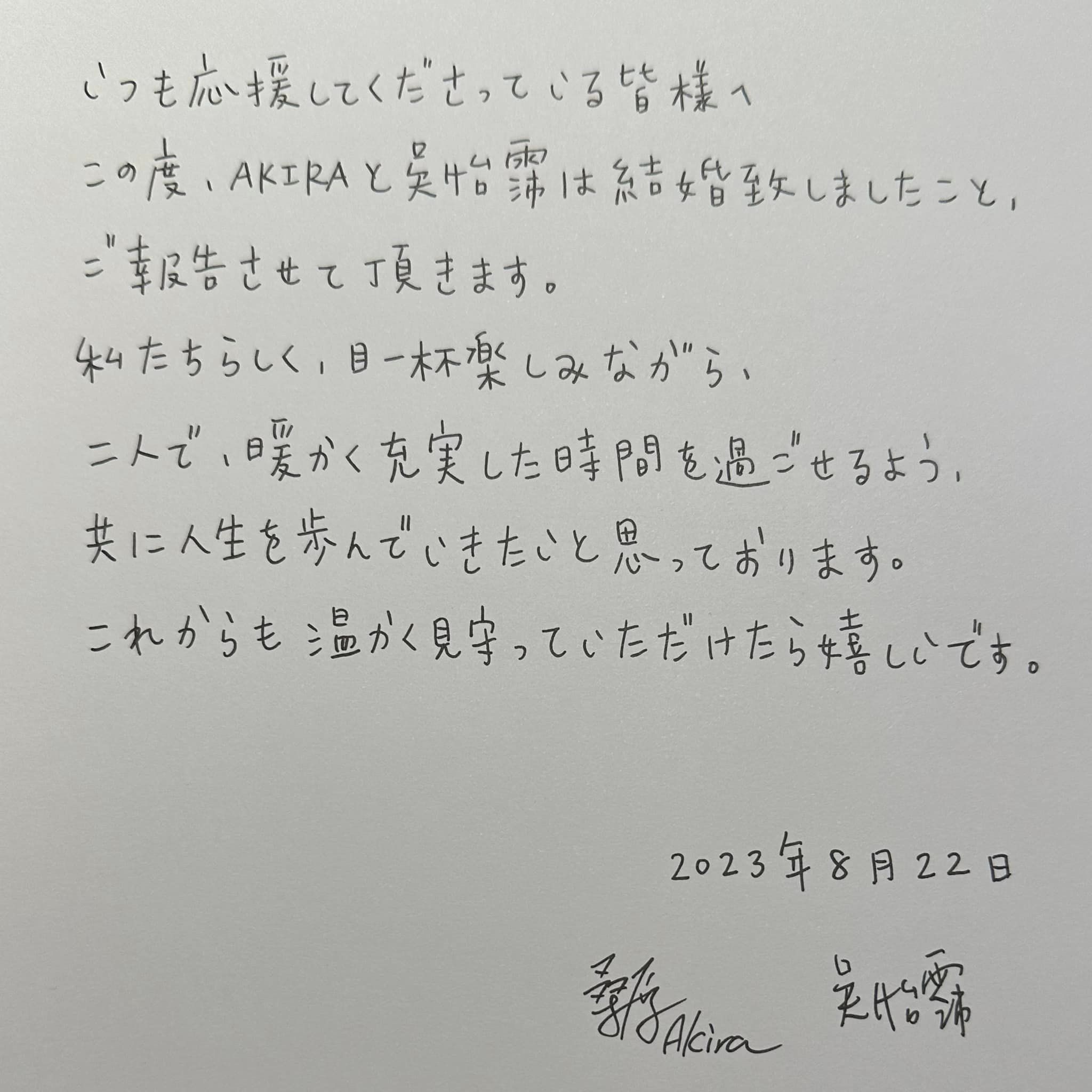 吳怡霈也曬出字跡可愛的日文手寫信,還在貼文中細述Akira的好:「他是個靦腆的日本男子,情感含蓄,全部藏在生活細節裡。可以在我最失溫的冬天收工夜裡,讓我一進家門就吃到暖呼呼的Akira 本格關東煮;可以跪在雪地裡不厭其煩,等著哭完才願意從雪板上站起來的我。」