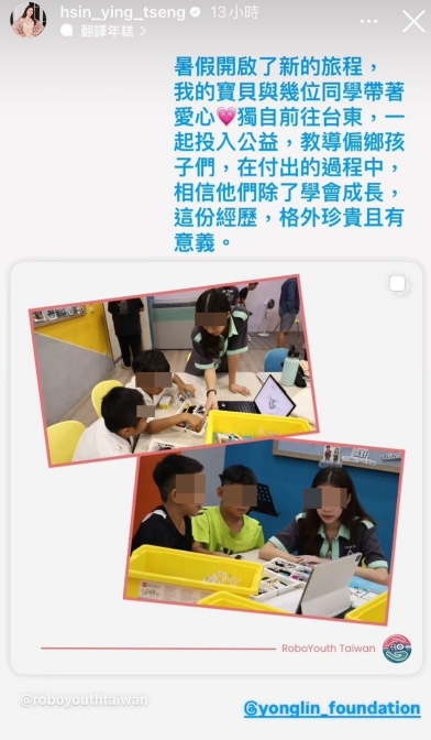 曾馨瑩在社群平台分享女兒的善行時欣慰表示:「暑假開啟了新的旅程,我的寶貝與幾位同學帶著愛心,獨自前往台東,一起投入公益,教導偏鄉孩子們,在付出的過程中,相信他們除了學會成長,這份經歷,格外珍貴且有意義。」眾多網友也紛紛留言:「好棒的富家女孩!」、「有愛心又漂亮!」、「青出於藍!」、「比美貌更重要的是那顆善良的心!」、「未來的愛心企業家!」