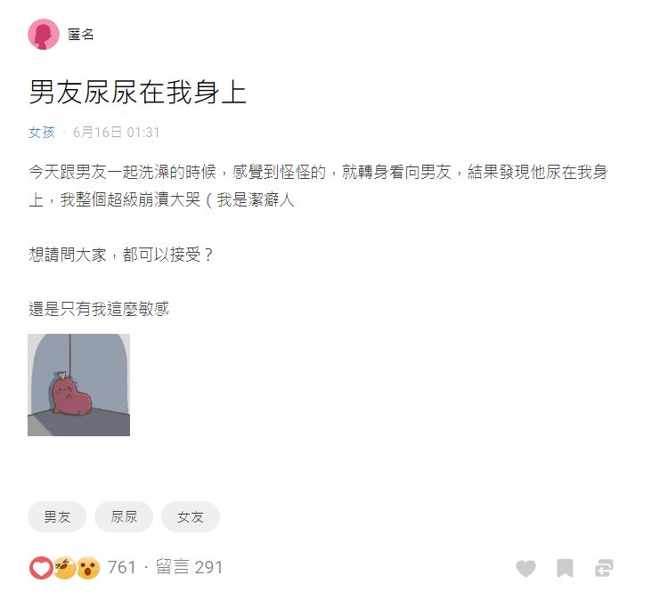 她表示男友竟趁她不注意時,竟尿在她的身上,讓她當場崩潰哭出來。原PO更發文提問:「想請問大家,都可以接受?還是只有我這麼敏感」。