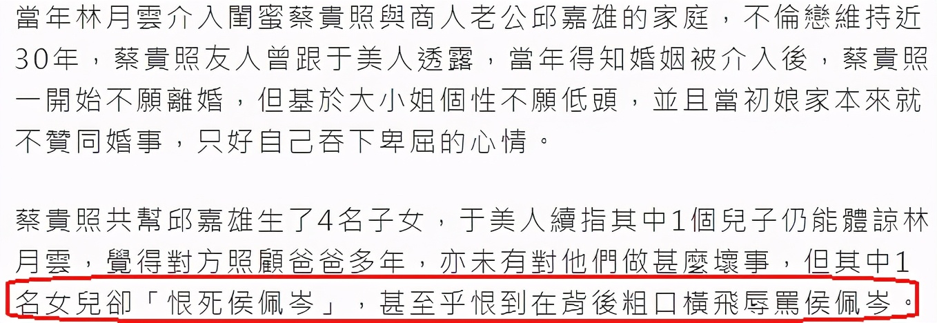 友人更透露蔡貴照當年受的苦難,全是林月雲給的,還表示蔡貴照所生的4個子女中,兒子仍舊無法原諒林月雲,甚至蔡貴照的女兒恨死了侯佩岑,形容她和母親一樣為了錢都是骨子裡的不好。