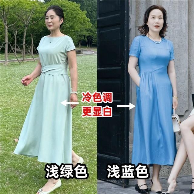 中年女人在挑選連身裙時,盡量可以選擇冷色調,顯白效果要更好,比如淺綠色和淺藍色用於長裙當中,立馬就能改善膚色暗沉發黃的問題,不需要加入多餘的裝飾和元素,透過收腰設計、勾勒出腰線即可。