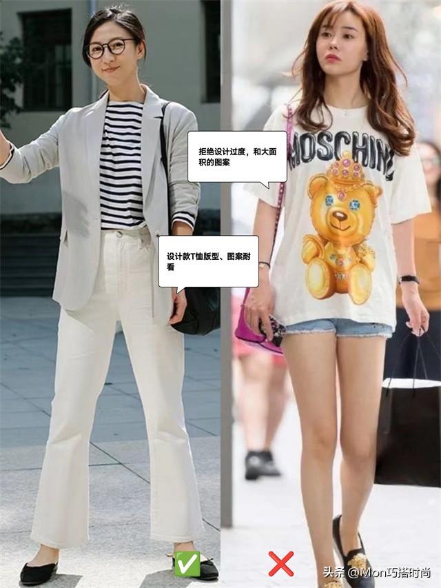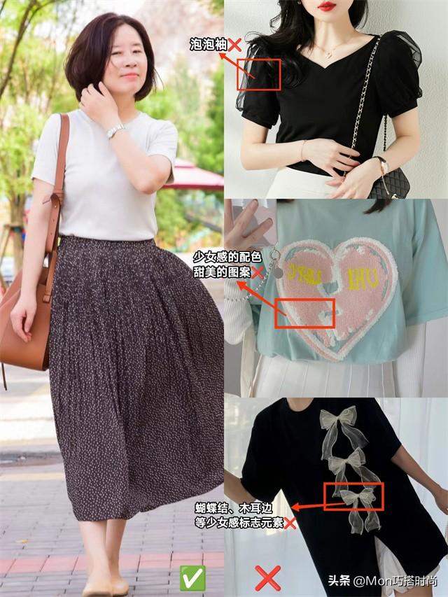 別在不合適的年紀穿著太幼稚、少女的服裝。蕾絲、雪紡等甜蜜風材質;蝴蝶結、泡泡袖等少女感標誌元素;活潑的少女感配色、甜美的圖案都別出現在T恤上!