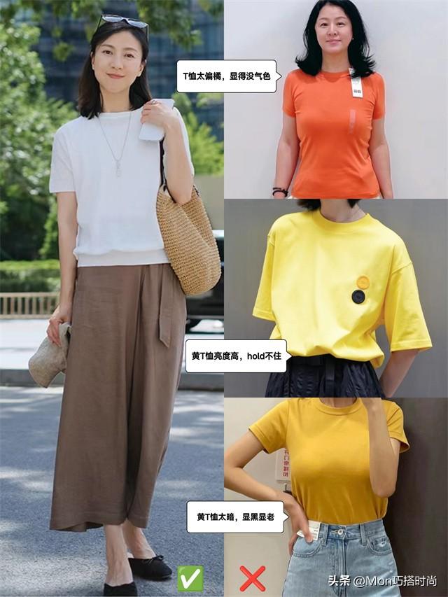 亮度太高的黃色系T恤,中年人根本hold不住。色調太暗、以及接近膚色的淡黃色、橘色調黃T恤都顯黑顯老,別讓這類黃T恤出現在衣櫃里~