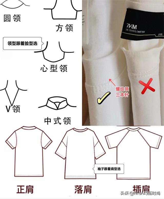 臉型圓、方就多穿圓領,V領和心形領T恤;臉型瘦長要穿方領、大圓領或中式領。任何肩型都適合正肩線,溜肩還適配小落肩T恤,插肩袖更適合寬肩。