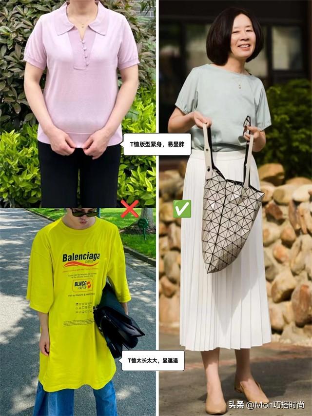 有不少上了年紀的女人也會有身材發福、體型變胖的擔憂,把T恤穿了會顯胖。但只要選擇版型合身的T恤就沒問題。