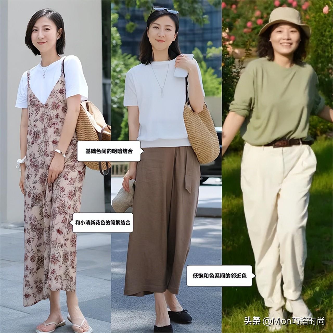 經典款白T恤可與清新小花色服裝簡繁結合;基礎色服裝明暗搭配清爽利落;也可選低飽和的莫蘭迪色系的T恤配鄰近色下裝。這種弱化視覺衝擊的配色更有中年女人的優雅~
