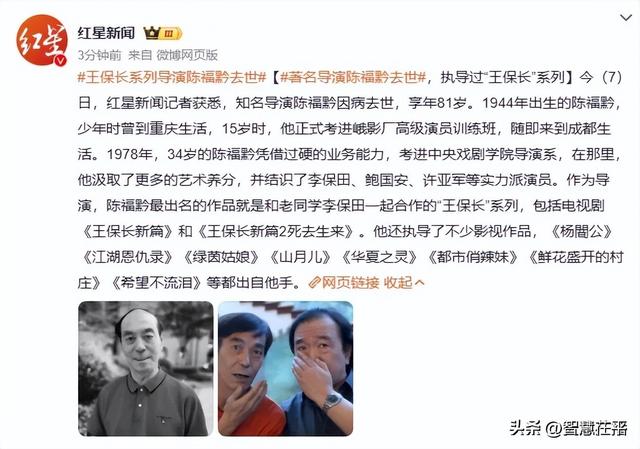 又一影業巨擘離世!2月7日,知名導演陳福黔因病去世,享壽81歲,其代表代表作包括與李保田一起合作的「王保長」系列,影視作品包括《楊闇公》《江湖恩仇錄》《綠茵姑娘》等。