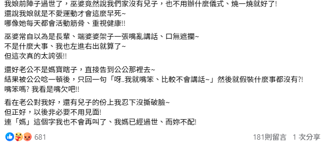 一名女網友當時在臉書社團「毒姑九賤婆媳討論區」發文抱怨,媽媽前陣子過世,婆婆竟然口無遮攔,「我們家沒有兒子,也不用辦什麼儀式、燒一燒就好了」,還酸原PO母親「就是不愛運動才會這麼早走,哪像她每天都會活動筋骨、重視健康」,一席話也讓她聽了相當難受。