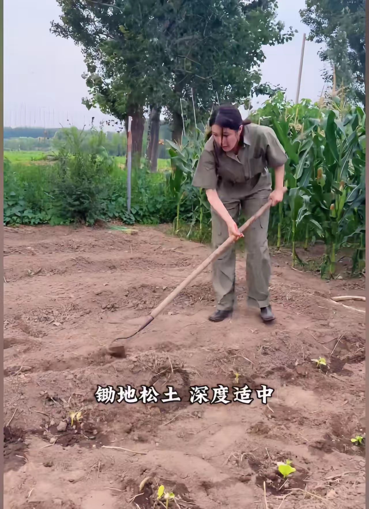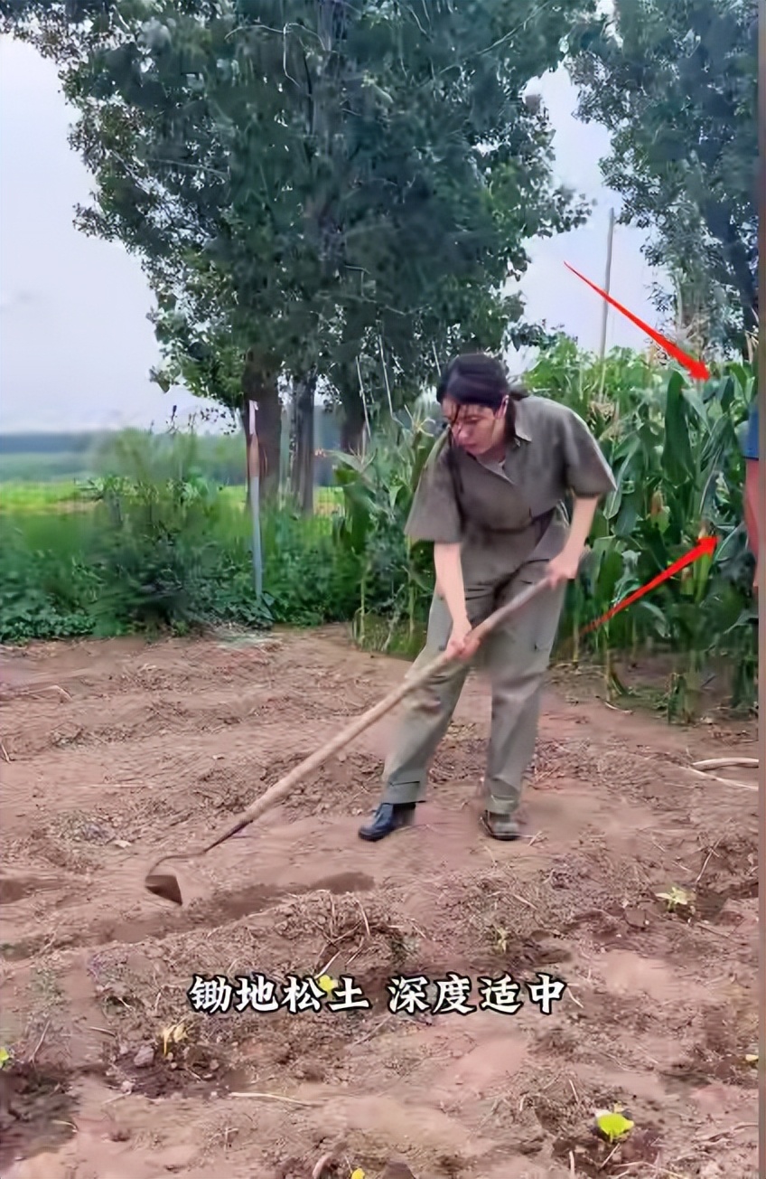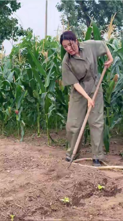 雖然曾黎是一名大明星,但是扛起鋤頭幹活的模樣非常熟練。她弓著身子、彎著腰,手裡的鋤頭正在聽話的翻地。