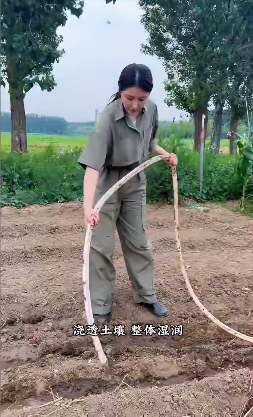 曾黎手裡的鋤頭蠻聽話的,她認真的刨地、還不停地澆水。土壤鬆軟以後,就可以適當的澆水了。