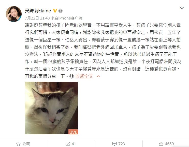 據《香港01》報導,據了解,吳綺莉一直對於媳婦Andi的作法不滿,去年7月還疑似發長文控訴,文中寫道「謝謝妳來我家把我的東西都拿走,用來賣,5年了還像一個巨星一樣、怕給人認出,帶著孩子穿到像一隻鸚鵡一樣站在街上等人拍照、然後怪我們害了她,35歲還怪別人的家長不給她資助費」,並坦言「孩子為了愛要跟著她我也沒辦法」。字裡行間充斥著滿滿的無奈,網友也猜測文中指的女性是她的媳婦Andi。