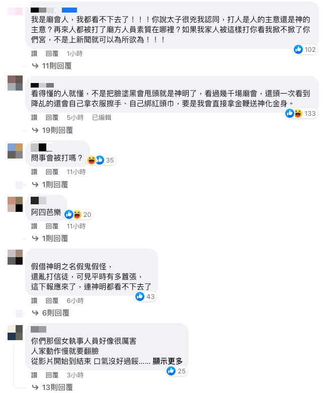 事後,短髮女子痛苦低頭,狂揉雙眼,足見傷勢不輕,但身旁眾人卻恍若無聞,繼續完成著裝、接神工作。一名在旁觀看的老伯實在看不下去,便上前關心女子,但暴力畫面早被一旁的信眾錄下,並上傳到臉書社團「爆料公社」。許多網友認為乩童太超過,紛紛到廟方粉專留言痛罵,「我一直覺得神明都很慈悲,不懂這位乩身為啥動手」、「都沒有人安慰被打的那位小姐耶!是習以為常了嗎」、「不管神多厲害,打人就是不對」、「問事安全帽請戴好」。