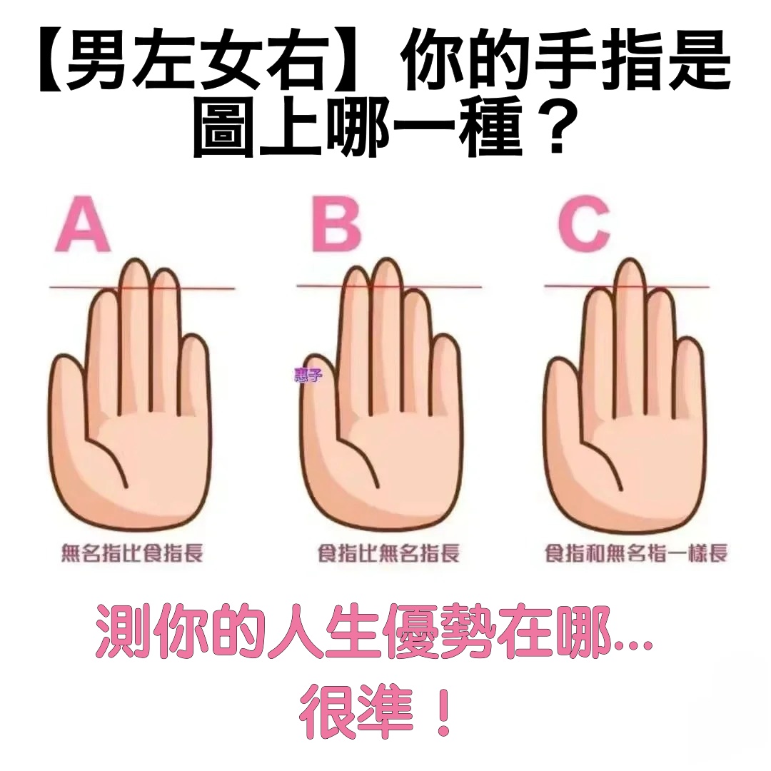 許多人都相信「手相」多多少少會反映你的人生命格,以下有個測驗就是透過手指的長度,來看看你的異性緣、待人處世之道、事業運優勢在哪?快來看看你是哪一種吧!