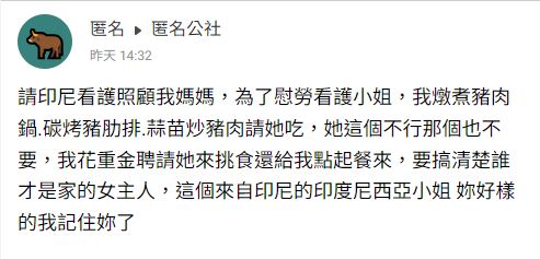 據《TVBS》報導,原PO自認花了重金、聘請看護照顧媽媽,為了慰勞看護小姐,她便下廚煮了豬肉鍋、碳烤豬肋排、蒜苗炒豬肉,「結果她這個不行、那個也不要,挑食還給我點起餐來,搞清楚誰才是家的女主人!」文末,她也點名對方是來自印尼的外傭,語氣相當不善。