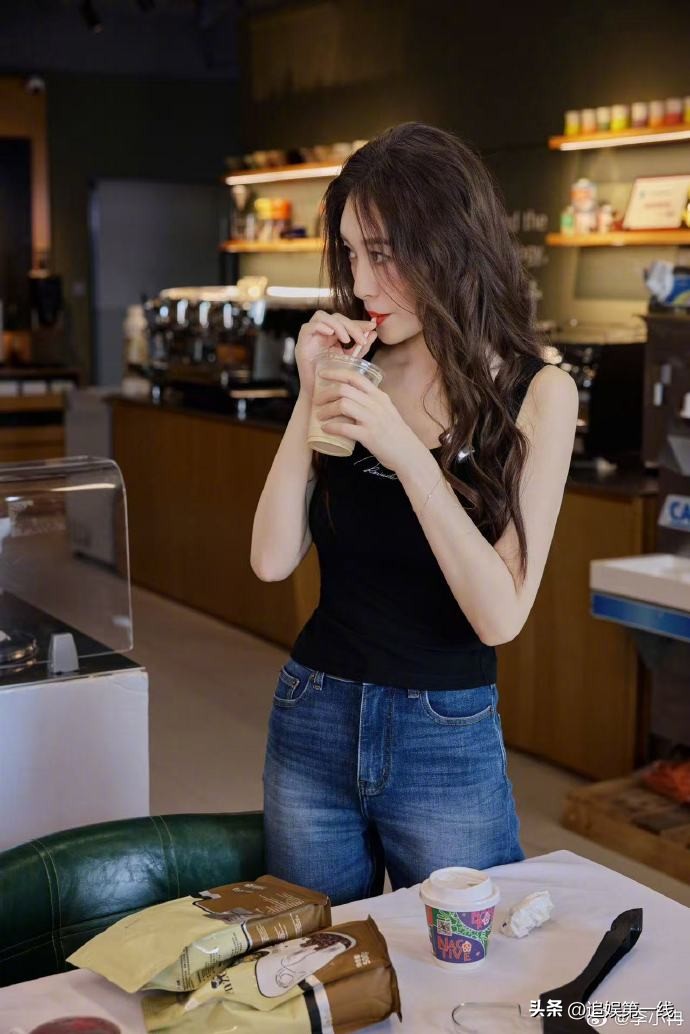 照片中的她穿得特簡單,一件黑色吊帶,剪裁還挺利落的,搭了條經典款牛仔褲 —— 不是那種花里胡哨的款式,卻特別顯腿長。臉上沒塗啥厚重濃妝,就坐在露天茶座上,手指捏著茶杯慢慢喝,偶爾跟身邊人小聲聊兩句,那股子鬆弛又自在的勁,看著就特別舒服。