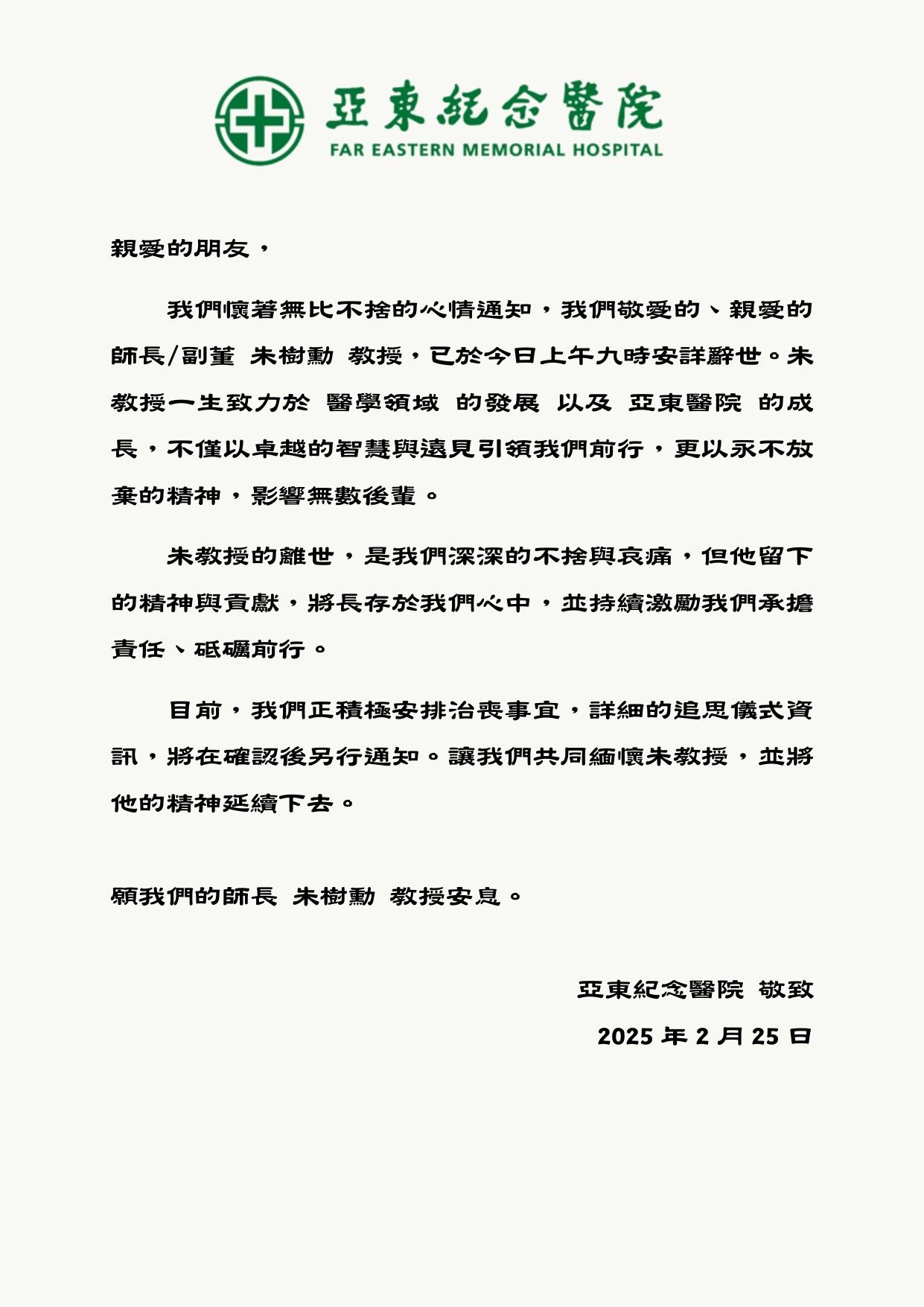 亞東醫院發表聲明表示,朱教授雖然離開了,但他留下的精神與貢獻將永遠存在於後進心中,繼續激勵醫界同仁承擔責任、努力前進。醫院目前正積極籌備治喪相關事宜,以最誠摯的心意送別這位醫界巨擘。