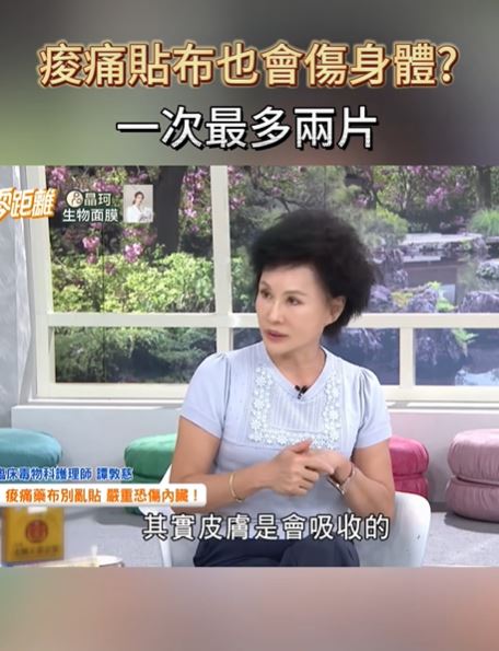 據《ctwant》報導,譚敦慈在《健康零距離》向觀眾衛教,痠痛藥布也會傷身,一次最好不超過兩片。她曾看過有患者一次貼七、八片,或是貼了一整天,結果胃出血、腎臟受傷,其實是因為大部分的痠痛藥布,成份就是水楊酸和非類固醇的消炎止痛藥,這些物質被皮膚吸收過量後,就會造成問題!