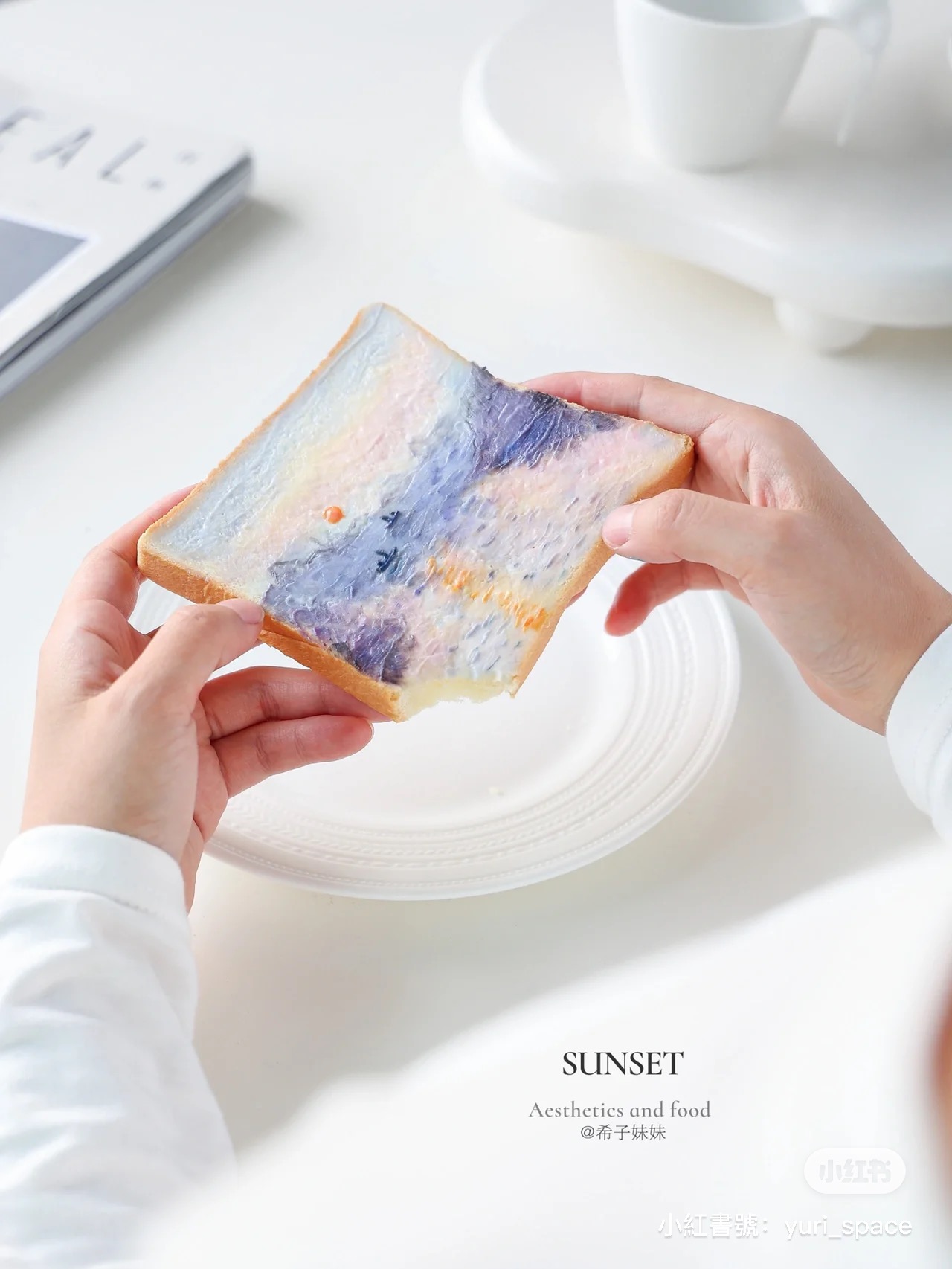 這次她將芋泥融合到油畫吐司上,再利用果蔬粉加上芋泥作調色,一層層將不同顏色的果醬顏料塗抹在吐司上,看起來真的超級夢幻!