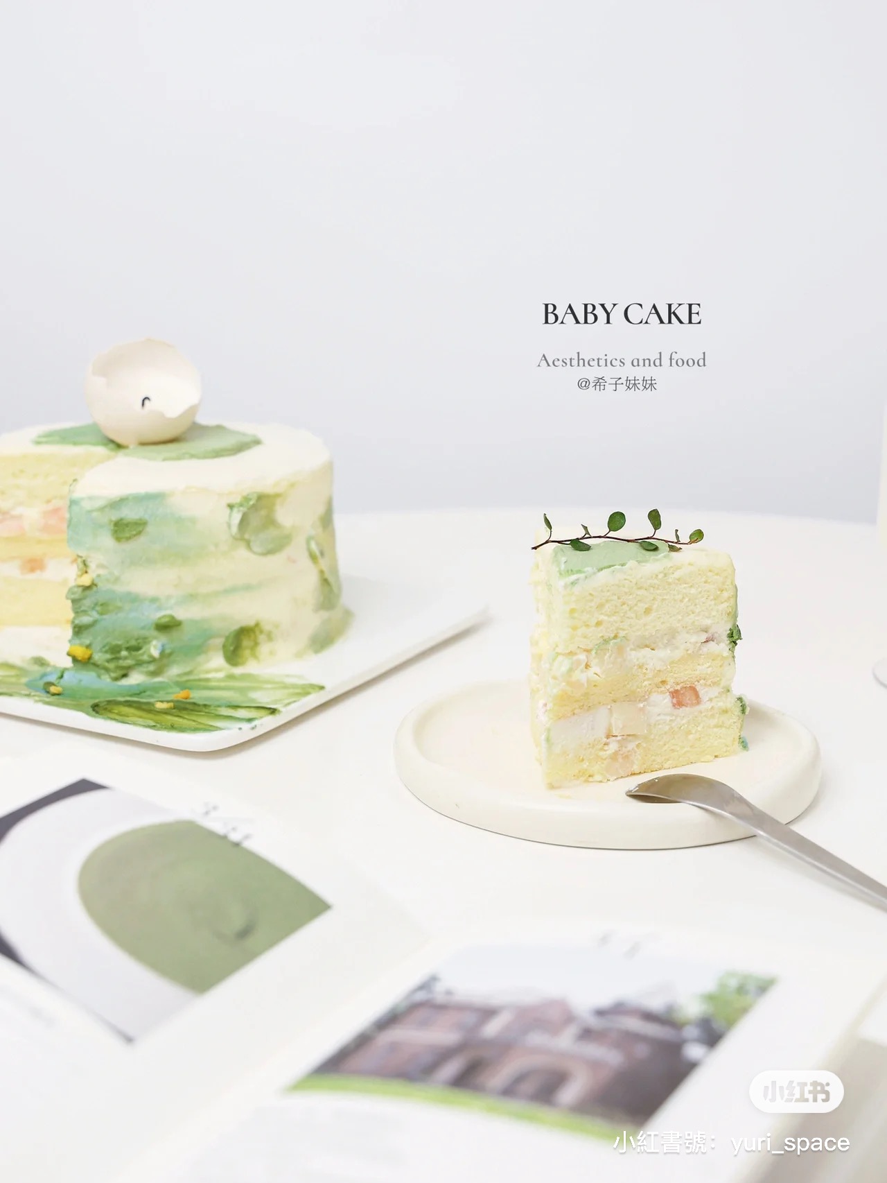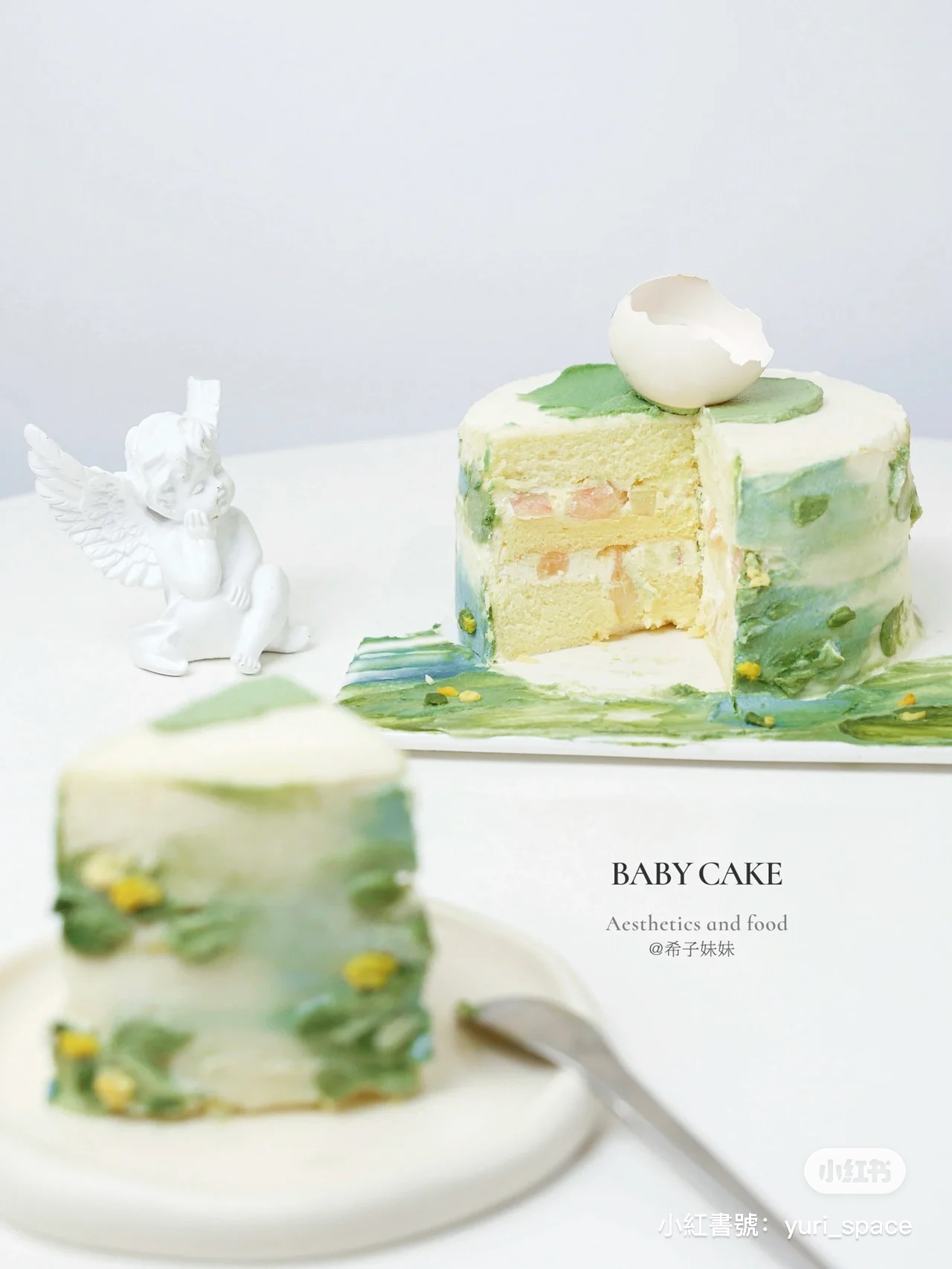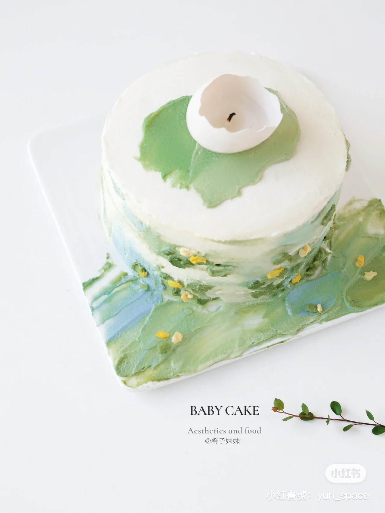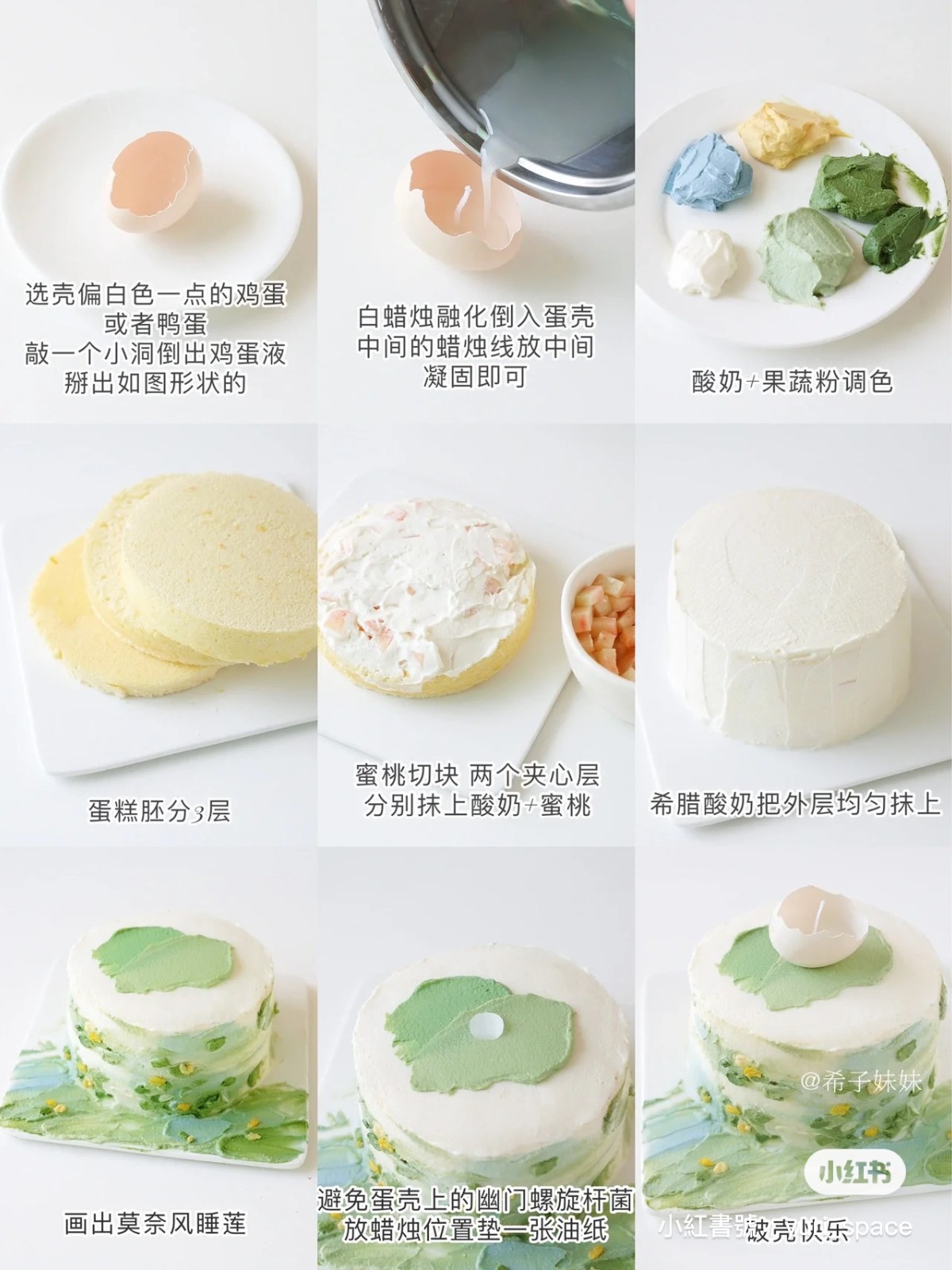 這款睡蓮蛋糕也超級漂亮,博主也特別在網路上分享了食譜和手作細節,基本上就是將蛋糕體先完成,之後再利用優格加入果蔬粉調色,先在蛋糕表層塗上白色希臘優格,接下來再將調好的果醬上色,接著再畫出莫奈風睡蓮~