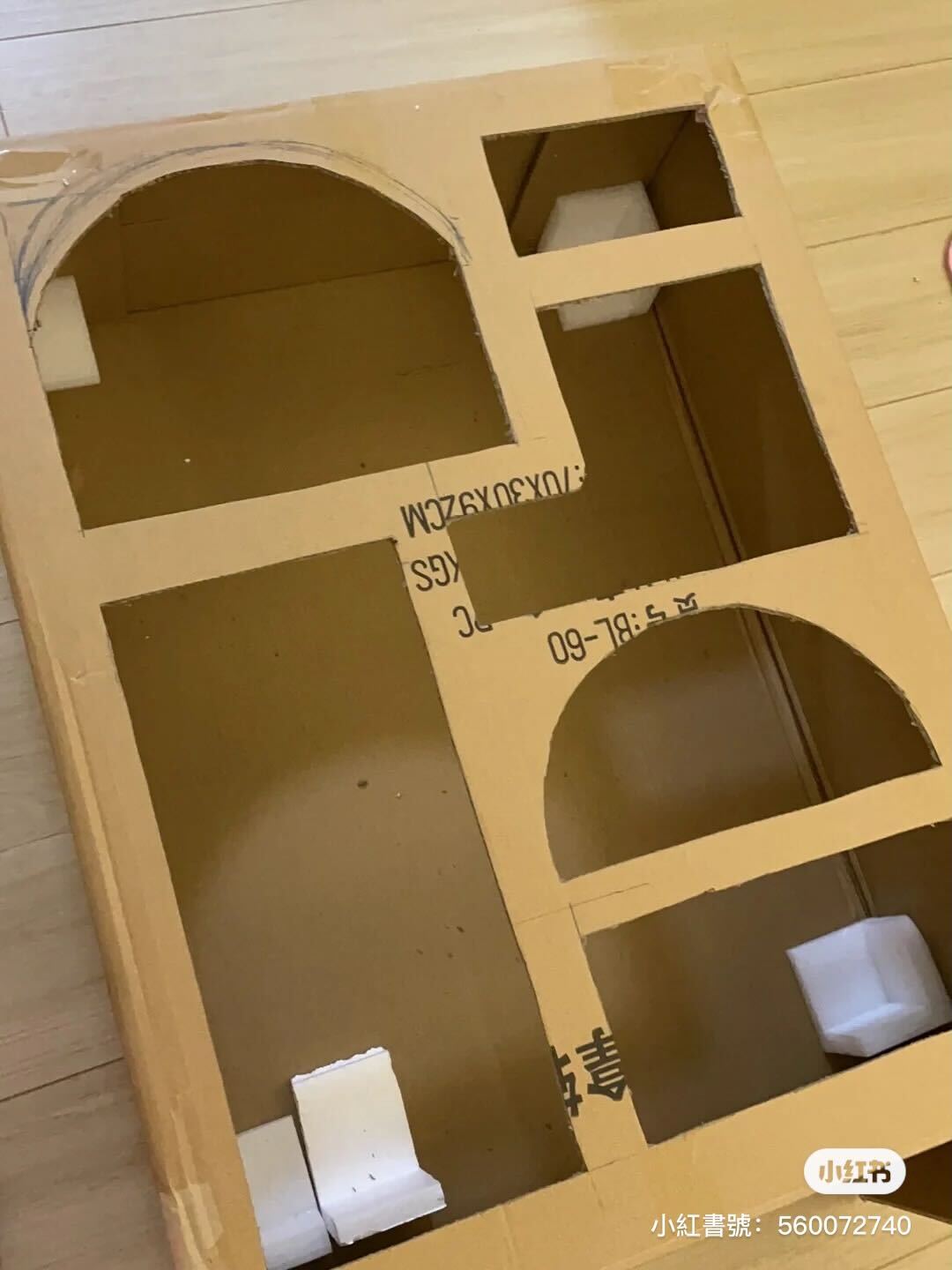 可以看到優等生小李在改造紙箱時,先是把紙箱用美工刀切開各種圓形、方形的洞,營造出櫃子得以讓手伸進來的區域,同時割下來的紙片都留著當作之後要放在櫃子裡的隔板~
