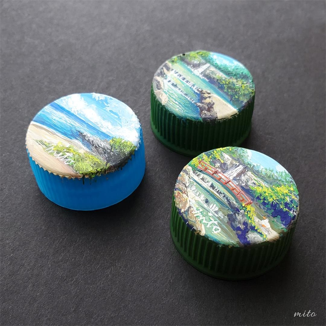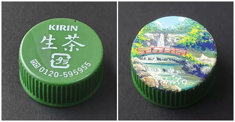 西倉ミト擅長用壓克力顏料把瓶蓋重新繪製,可以看到原本綠茶的綠色瓶蓋經過改造後,竟然變成小橋流水的山林景色,而據說這些畫面都是她在旅行時候記錄下來的,把瓶蓋當寫生的一種工具實在太特別~