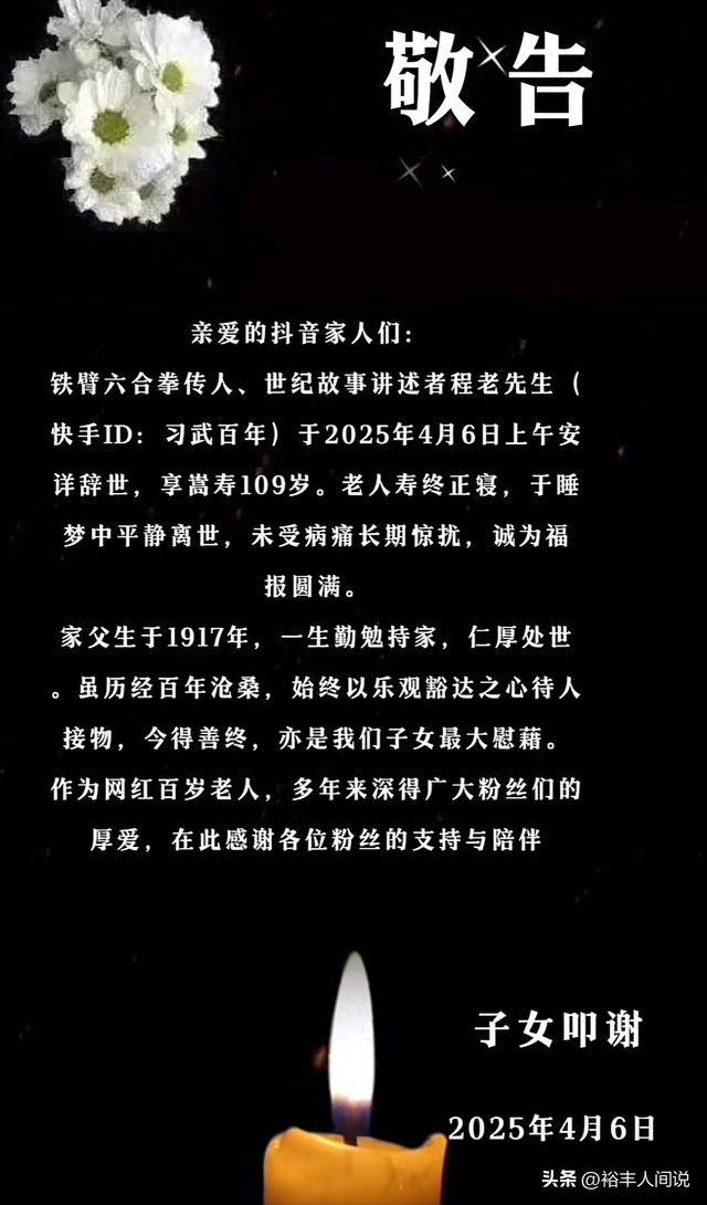 4月6號晚,來自中國天津的「習武百年」分享悲痛消息,鐵臂六合拳傳人,世紀故事講述者,同時在網路上小有名氣的百歲網紅程老先生去世,享嵩壽109歲。