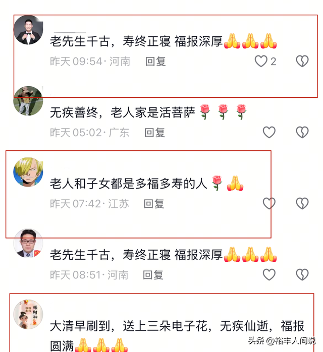 據其家人透露,程老先生去世的時候很安詳,在這之前也沒有任何疾病困擾,所以對於其後人,以及他本人來說,這樣的噩耗算是一種「喜事」,人生百年,難得壽終正寢,能夠無病無災,且一生順遂,這是何等的幸運。