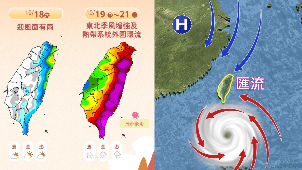 中央氣象署特別提醒,從週六到下週二將是外圍環流影響台灣最明顯的時期。台北、新北、基隆、宜蘭、花蓮、台東等六縣市可能出現較大降雨,尤其基隆北海岸、東半部地區、恆春半島及大台北山區更可能出現大雨或豪雨等級降雨。