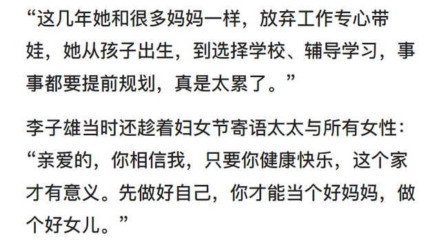 李子雄表示,妻子放棄工作專心帶娃,從兒子出生一路照顧到上學擇校、輔導作業,李子雄最近給妻子送上結婚10周年驚喜,又帶妻子出門放風,能看到王雅琦狀態明顯回春。