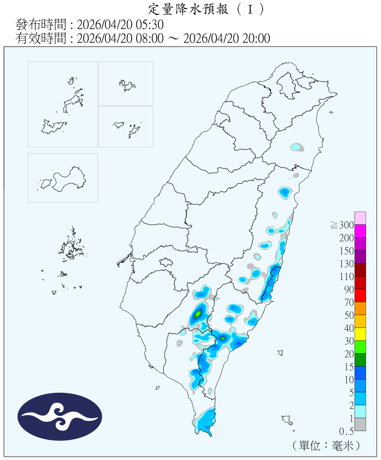 今(20)日全台各地以晴朗到多雲天氣為主,僅花蓮、台東跟恆春半島有局部陣雨現象,宜蘭山區以及午後的高雄、屏東、中南部山區會出現零星降雨。清晨受到輻射冷卻效應,北部跟東北部低溫約落在攝氏18至20度之間,其他區域則為21至23度,不過白天在陽光照射下,溫度會明顯攀升,東半部最高可達27至29度,西半部普遍上看30至32度。