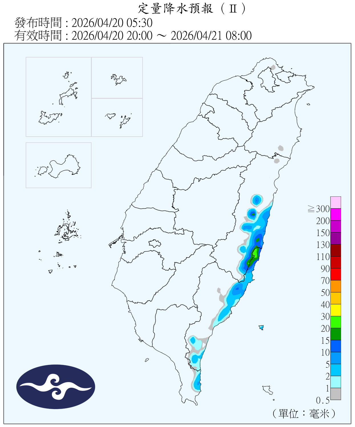 周二迎風面的水氣略為增加,花東及恆春半島會有局部陣雨,基隆北海岸、宜蘭跟大台北山區有零星降雨,午後高屏及其他山區也會出現零星陣雨;周三環境場轉為偏東南到南風型態,僅台東跟恆春半島有零星陣雨機率,午後大台北、南投、宜花及其他山區有零星降雨可能。