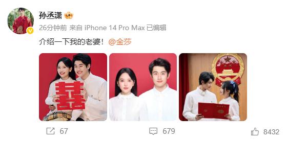 隨後,孫丞瀟發文:介紹一下我的老婆!@金莎