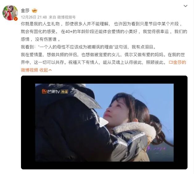 2023年,金莎曾在微博中提到,孫丞瀟就是自己的「人生禮物」,她說,「即使很多人並不能理解」,但在自己40多歲的年齡階段還能體會愛情的小美好,「我覺得很幸運,我們的感情,沒有傷害誰。」