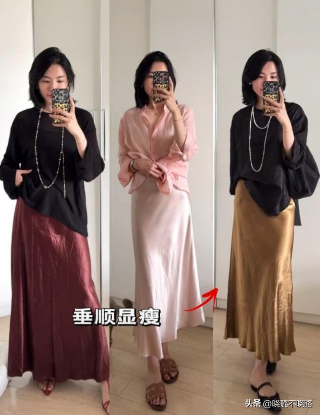如果要評選五十歲女性的「本命裙」,非緞面或醋酸材質的直筒長裙莫屬。這類面料自帶流動的光澤感,無需複雜的圖案就能彰顯昂貴的氣質。這種裙子的垂墜性極好,能夠順著身體線條自然下落,完美掩蓋腰腹和臀腿的贅肉,營造出一種「紙片人」的視覺效果,舉手投足間儘是法式慵懶與東方溫婉。