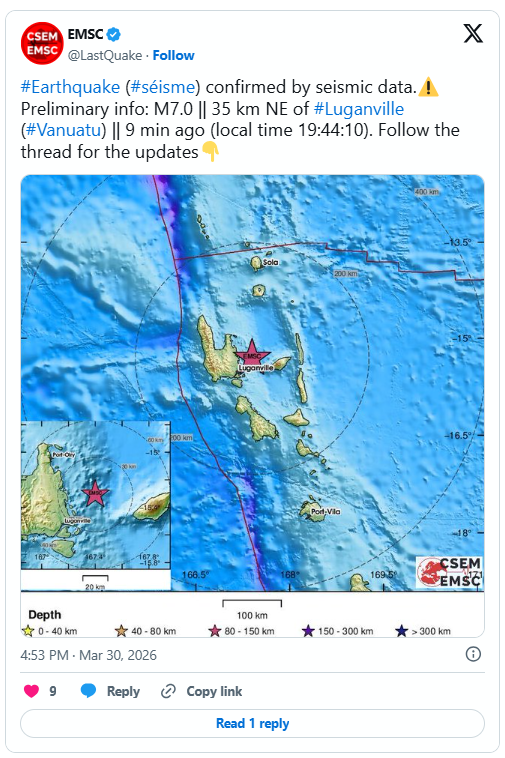根據《ettoday新聞雲》報導,南太平洋島國萬那杜在當地時間30日晚間7時44分(相當於台灣時間下午4時44分)遭遇規模7.3的強烈地震襲擊,震央位置就在盧甘維爾東北方約35公里的海域,震源深度測得約115.8公里。所幸目前相關單位尚未針對此次地震發布海嘯警報,當地民眾暫時不需要撤離。