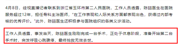 該工作人員透露,陳喆醫生當時剛剛完成了一台手術,正處於休息階段,準備開始第二台手術時,突發呼吸心跳驟停。雖然醫院全力搶救,但還是不幸去世了。