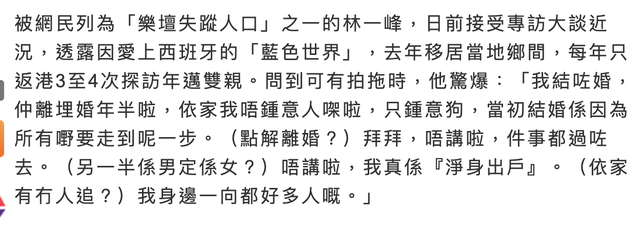 林一峰已甚少在香港公開場合露臉,還被民眾列為「樂壇失蹤人口」,日前被問及在當地生活是否有談戀愛,他突然自曝已婚,而更勁爆的是,公開婚訊時,他已經離婚一半年。立即引發媒體的瘋狂發問,不過他點到即止,對於相關的婚姻生活閉口不談,包括為什麼離婚,對象是誰,乃至另一半是男是女,他都不談。