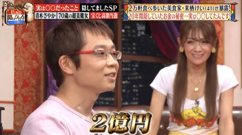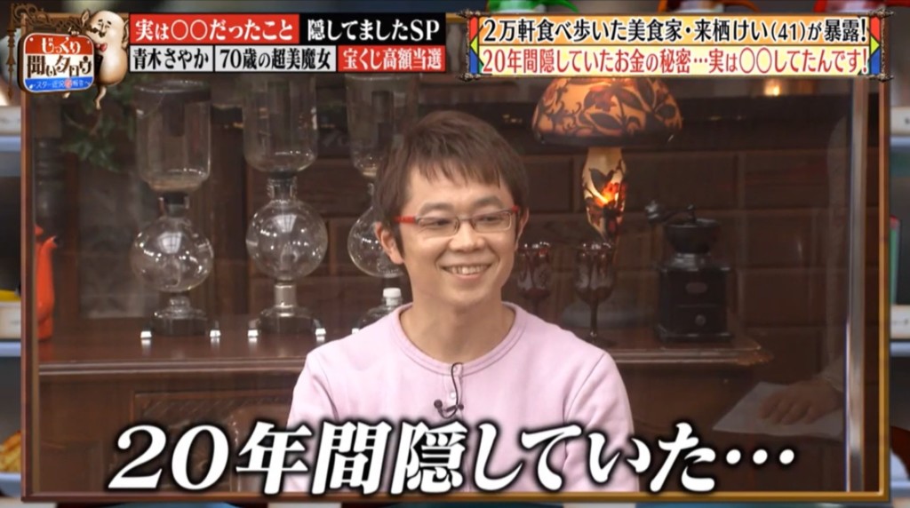 日本一位男子來栖けい在20歲生日當天順手買了彩券,沒想到幸運中了2億日幣 (約5千萬台幣) 的樂透!他並沒有告訴家人自己中了一大筆錢,也沒有亂花錢,不過從小就喜歡美食的他把這一大筆獎金全部拿來吃各種五星級料理的美食,結果30歲時就把5千萬花到只剩54萬!