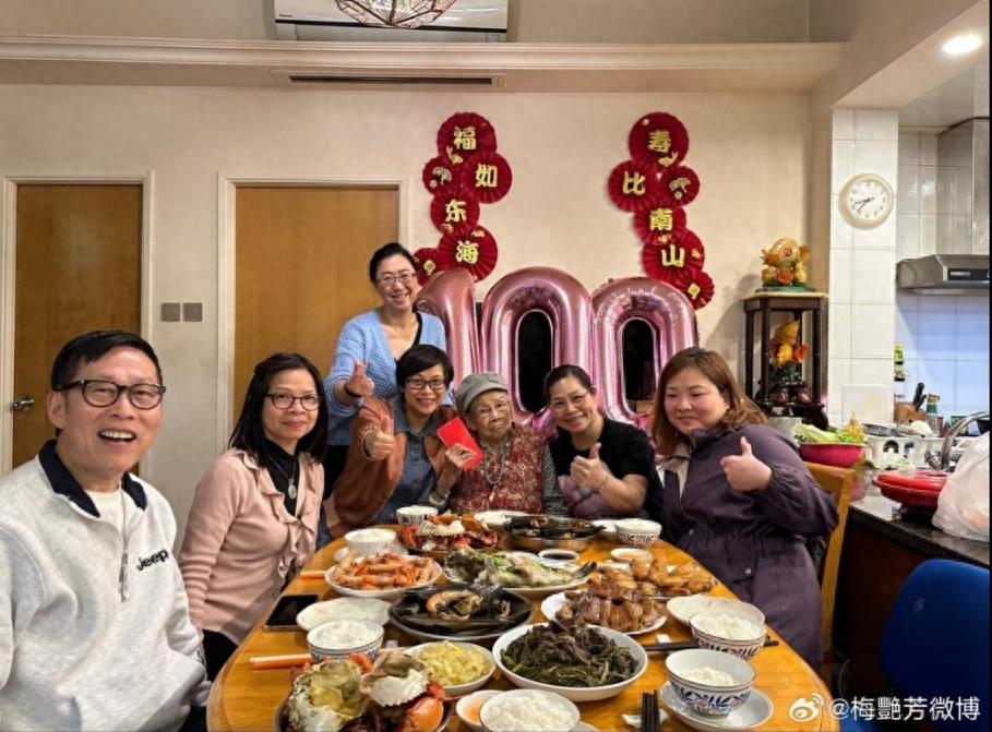 梅媽唯一健在的兒子梅啟明並未現身,但是不影響梅媽的好心情,而且老人居住的豪宅環境乾淨整潔,身邊有多位工人照顧,是她自己的福氣,也是梅艷芳的孝心。梅媽還曬出港府頒發的祝壽賀函及紅包,原來相關部門一早就得悉梅媽的生日,送上紅包及賀卡祝福,等梅媽到105歲時,他們會再次表達心意。