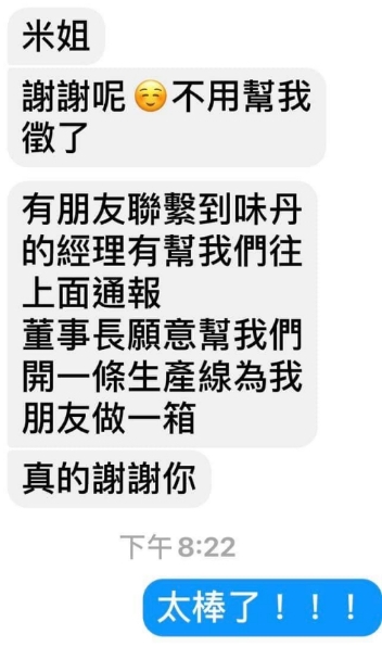 沒想到就在兩天後,居然傳出好消息!?據瞭解,有認識的朋友在這間食品公司上班,把狀況往上呈報後,董事長楊頭雄得知消息,二話不說直接霸氣「特別開一條生產線」製造,還送了一箱泡麵過去給病患,讓原PO真的好感動:「謝謝您加開產線只為了一個心願,萬分感恩!」