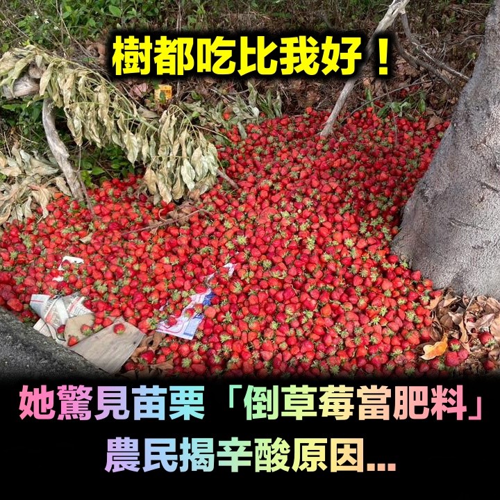 她驚見苗栗「倒草莓當肥料」笑了:樹都吃比我好 農民揭辛酸原因 長腿弟弟 2026-03-18 檢舉 分享到 Facebook 更有蓮霧果農道出心聲「我看了滿滿的無奈,以前老家種蓮霧,賣不出去的都倒掉做堆肥。很多人也問我為什麼不要低價賣,我說送人也沒人要啊,果皮發霉裂果的,送幾次給人吃還可以接受,送多次了人家就不想要了,所以就倒掉做堆肥了」。這番話語道出農民在豐收與耗損之間的兩難處境,也讓外界更理解農業生產背後的艱辛現實。本以為是撿便宜的時候,卻意外得知果農此舉的心酸,真的是一個看天吃飯的行業啊⋯⋯。資料來源:TEEPR亮新聞 Advertisements 回首頁 2/2 Advertisements 編輯精選推薦 More + 離婚11年!洪榮宏愛女結婚「終破冰前妻」 「2爸爸牽她進場」催淚畫面曝 弟成植物人、姊猝逝!玉女歌手「遭前夫設套」騙走娘家房產 「狠斬16年婚姻」近況曝 滿街都在穿!醫點名「這款鞋」少穿為妙:恐讓脊椎變形 教你「1招看腿型」秒挑到好鞋 晚年隱居台東!68歲名主持失蹤「車內身亡」 伴侶悲曝「死前做1事」:還掛念著我 治裝費都給寶貝!媽媽替女兒「天天換不同造型」風格超多變 正面一轉「仙氣高冷臉蛋」看了秒融化❤️ 44歲許維恩罹乳癌!醫示警「3日常用品」易致癌:別碰才能保命 登國際時裝周美翻!49歲舒淇「剪掉多年大長髮」 短髮封神「一轉身側面全空」驚艷米蘭 空窗多年!68歲陳美鳳突羞認「身邊有個他」 40年前就認識「遭男方母親拆散」 趕在40歲前閃婚!八點檔女星「宣布嫁給他」 尪驚人身分曝「媒人是柯叔元」 擦1次窗28元!窮街友「想湊4000元買眼鏡」 挨家挨戶求打工「超商店員一聽突伸手」百萬網友看哭 最新/3度中風送醫!資深男星爆離婚「斷50年髮妻」 「砸1億淨身出戶」家族爆紛爭 以為只是小感冒!本土女星悲痛證實「他併發肺炎過世」 一度淚灑現場「後悔同意插管」 快養不起小孩!本土男星「開計程車、斜槓房仲」 突宣布「離開台灣」:演藝圈沒工作 65歲男星獨居暴斃!大咖女星放下恩怨「送前夫最後一程」 昔遭動手6年嘆「死者為大」 功德圓滿了!台語歌后「悲曝他離世」享壽95歲 淚喊:去當快樂的神仙吧... 快訊/驚傳嚴重大火「至少50傷」!下令「全國消防動員」 台語歌后慟別摯愛!告別式上認「早隱瞞病情」 道歉哭喊:原諒我簽放棄急救 最新/賈靜雯深夜慟曝「她已離世」 淚PO合照喊:真的好愛你... 22歲愛女病逝!資深男星「走不出喪女痛」留白長髮現身 掛骨灰項鍊「代女做1事」惹淚 台灣人一致認同!國旅「最不想去縣市」第一名出爐 價錢過高「現場又很落漆」:不值得 24歲兒失明!于美人爆「他在飯店掃廁所」維生 不盼紅包只求「別再花我的錢」 15歲兒「睡夢中離世」!本土女星「送愛子火化」求做1事 「PO照圓滿了」:媽媽和你永不分開 到處都是黑白圖案!藝術家耗費2年「把整棟房子畫滿塗鴉」 用掉2296支筆「空拍照也超驚人」房價暴漲 事業風光情路坎坷!77歲女神「渣夫出軌還求復合」 她單身至今「被偶遇驚天一幕」:根本反人類 本土劇女星生了!7年前凍卵「終於來到我身邊」 歌手尪嗨喊:生個足球隊