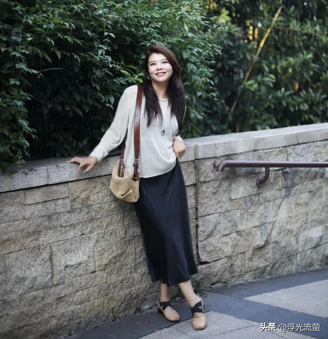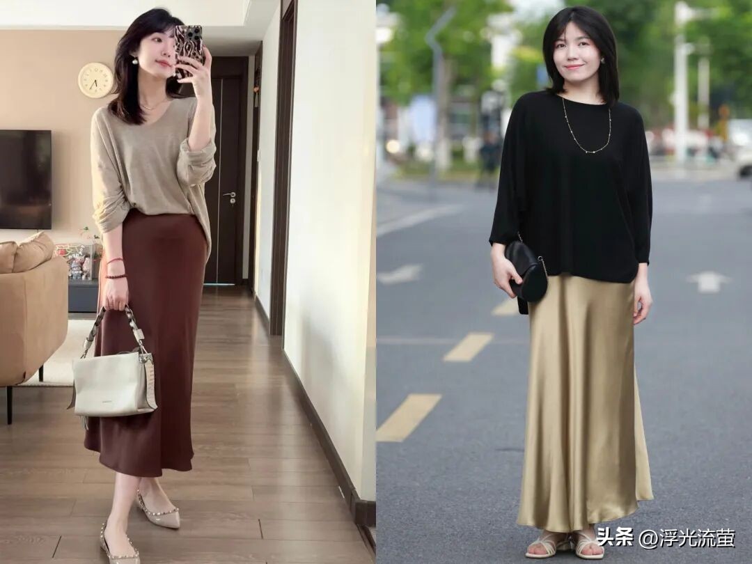 都是下搭一條真絲半裙,踩一雙淺口鞋、粗跟鞋。再拎一個手提包,顯得優雅的同時,還很有氣場。