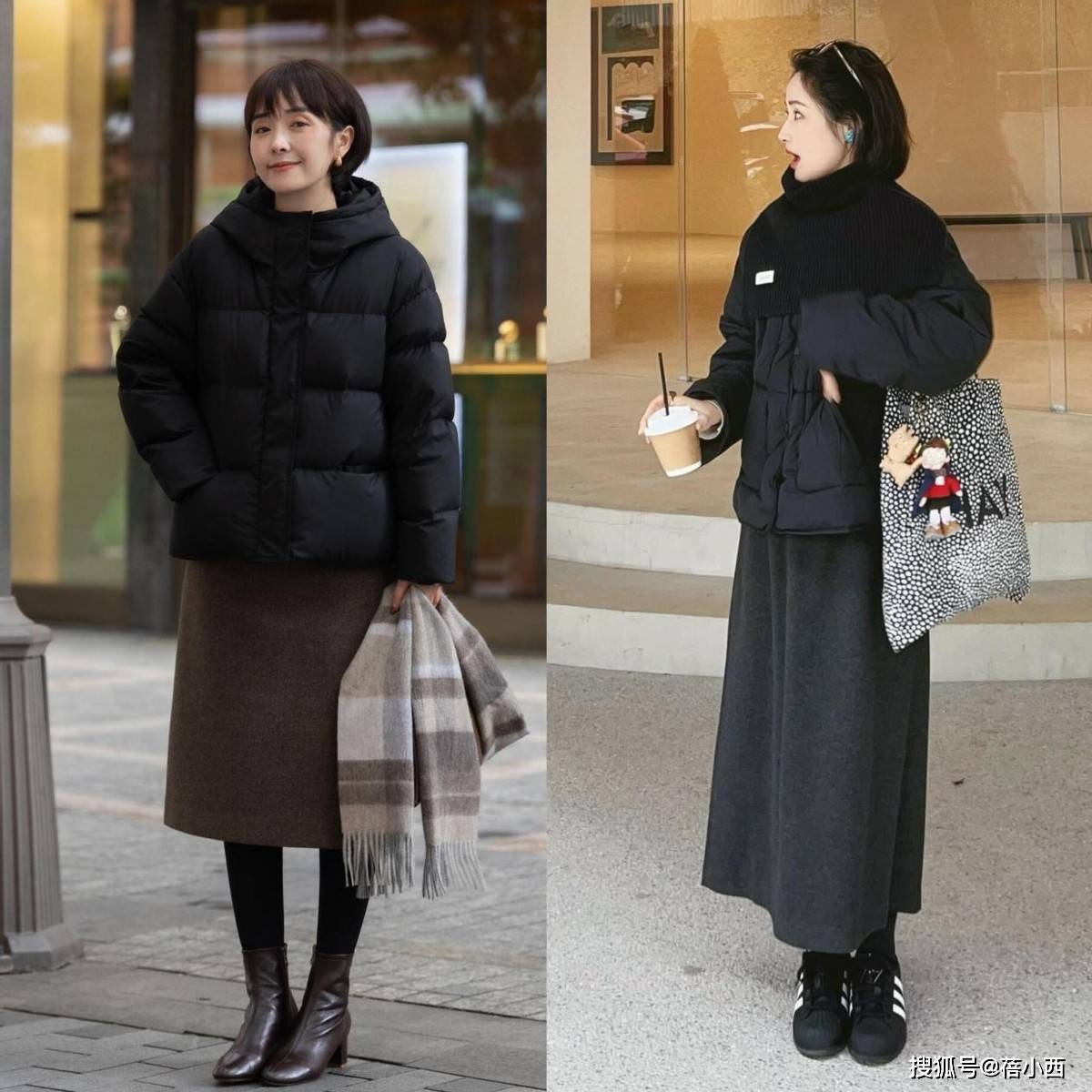 若是想要展現出女人味,可以用黑色羽絨服搭配半身裙,羽絨服選輕薄款,能避免過於蓬鬆,內搭修身針織衫,下裝搭黑色的半身裙,剛好可以形成同色呼應,裙擺長度別太短,到小腿中部最顯瘦遮肉,能恰好露出纖細的腳踝,降低臃腫感。