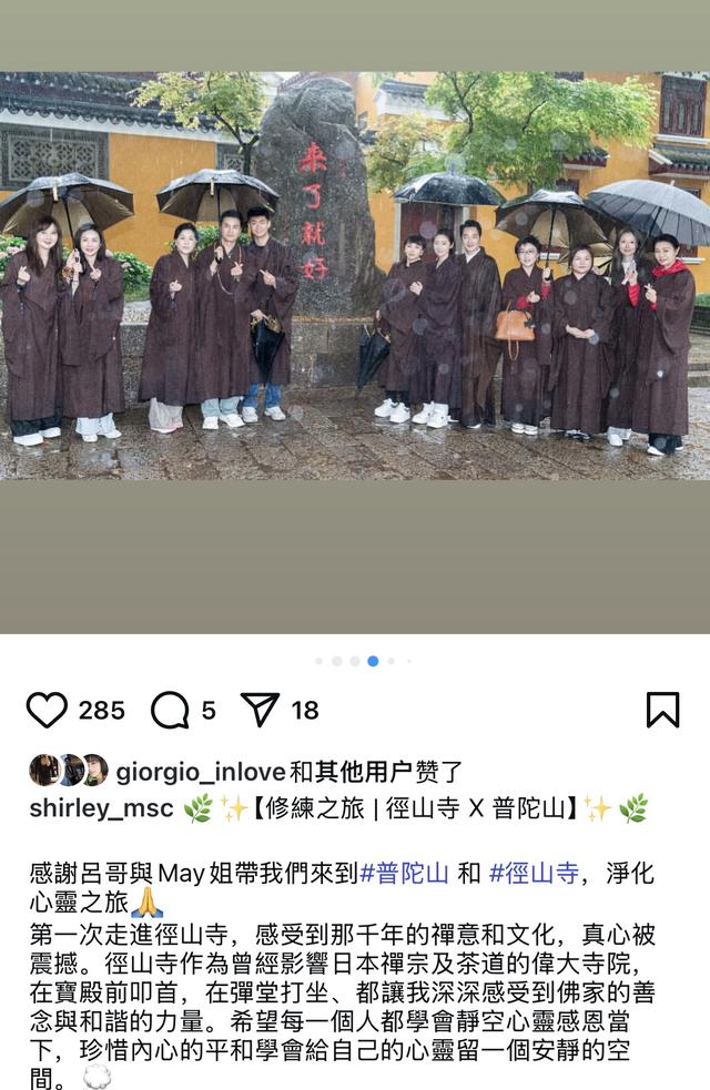 一行人在普陀山、徑山寺修行,組成了一個修行團,還不是隨便跪拜就完事,而是按照佛教的儀式進行修行。張玉珊換上了僧袍,掛上了佛珠,以表虔誠的態度。修行期間,她與其他信徒一樣,打坐念經,甚至叩首,毫不含糊。張玉珊是第一次到普陀山與徑山寺修行,她稱這是一趟凈化心靈之旅,第一次來就被震撼到,因為難得有這個機會在禪堂打坐,放空心靈,令她感受到了佛家的善念與和諧的力量。
