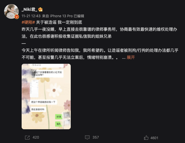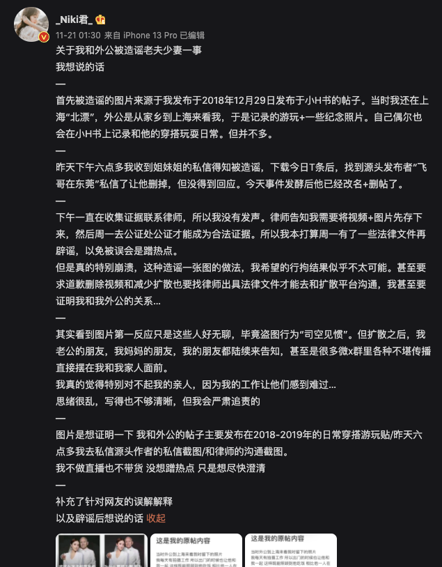 面對自己名譽受損一事,_Niki君_表示自己起初有要求造謠者刪文,但始終都沒有得到回應,直到如今廣為流傳之後才刪除,對於不肖人士的造謠,也感到相當氣憤地提告,「但是真的特別崩潰,這種造謠一張圖的做法,我希望的刑拘結果似乎不太可能。甚至要求道歉刪除視頻或減少擴散也要找律師出具法律文件才能去和擴散平台溝通,我甚至要證明我和我外公的關係...」。